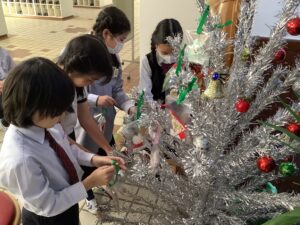 2学期最後の活動では、昇降口のクリスマスツリーに自分たちで飾り付けを行いました。手芸クラブを通して、クリスマスのお祝いができたことをとてもうれしく思います。
