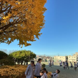 今日もこの大銀杏に見守られて、子どもは、寒い日でも広い校庭を元気よく遊んでいます。